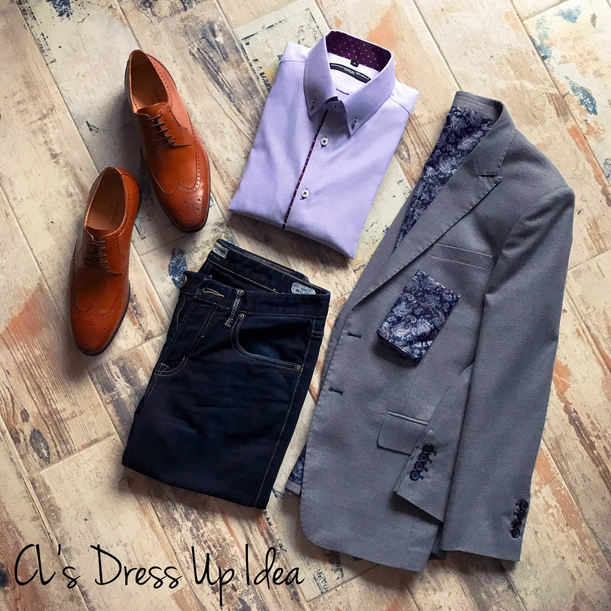灰色西裝外套和牛津恤衫可以打造優雅的風格,紫色元素提升了秋冬浪漫感,配襯牛仔褲是不想看起來太過正式,穿上Brown Brogues更帶出整體的休閑感。